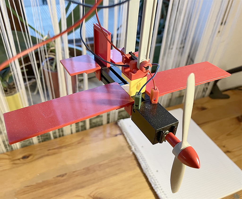 Die Aufhängung geschieht durchs “Einhängen” des gelben Statikträgers 15, der also zum Flugzeug gehört. Das ist leicht lösbar, sodass rasch verschiedene Flugzeugtypen eingehängt werden können.