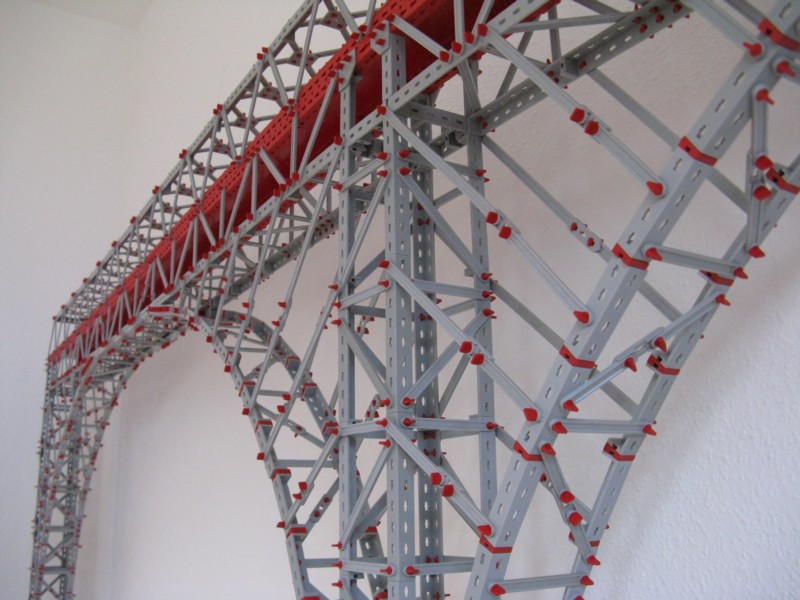 180 x Winkelträger 120 grau (in den Pfeilern und im Brückenoberbau) 48 x U-Träger 150 rot (im Brückenoberbau) 96 x I-Strebe 120 grau (im „Brückenkopf“) 20 x Platte (große Statikplatte) 180 x 90 rot (Fahrbahn) 38 x Kreuzknotenplatte grau mit je vier angesetzten (=152 Stück) X-Streben 42,4 grau (im „Brückendach“) ca. 200 x X-Strebe 106 grau (in den Pfeilern und im Brückenoberbau) ca. 200 x I-Strebe 75 grau (in den Pfeilern und im Brückenoberbau) 16 x Winkelträger 7,5° grau (in den ¼-Bogen) 96 x Winkelstein 7,5° rot (in den ¼-Bogen) ca. 120 x Winkelträger 60 grau (davon 104 in den ¼-Bogen) Rund 3000 x S-Riegel 4 rot u. v. m.