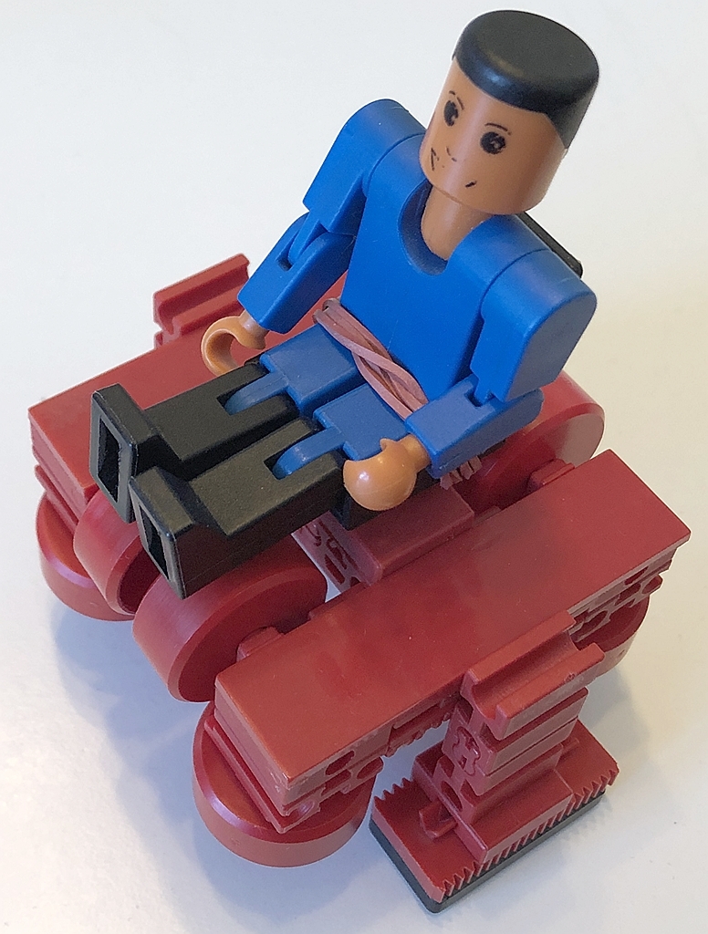 Je ein Männchen sitzt - nun also doch mit einem Fremdteil - mit einem Gummi angeschnallt auf einem solchen Wagen. Links und rechts laufen Platten 15x60, und eine dritte liegt andersherum quer unter der Wagenmitte. Die beiden mittleren Zapfen aller drei Platten tragen je einen BS7,5, dessen Nuten alle in Längsrichtung zeigen.