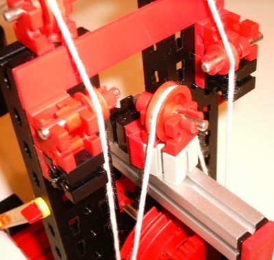 Besonderes Augenmerk gilt dem Baustein 15 mit rundem Zapfen, der durch einen Winkelstein 15° fixiert ist. Falls kein solcher Baustein zur Verfügung steht, kann auch ein normaler Baustein 15 verbaut werden (Zapfen zur Seite ausrichten). Doch dann ist unbedingt auf beiden Seiten ein Winkelstein 15° zum Stützen erforderlich.