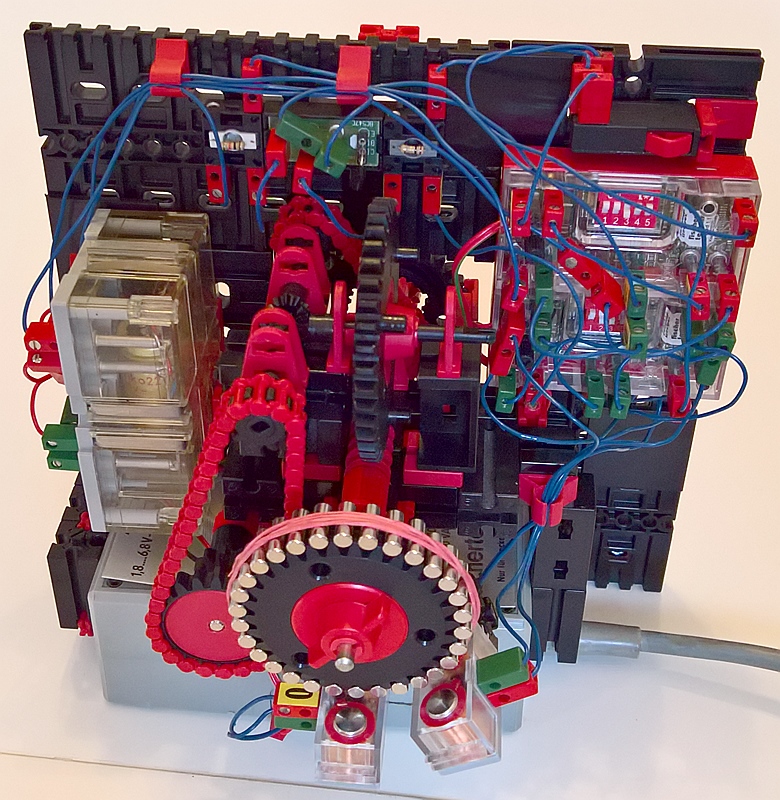 Die schwarze Frontplattenkonstruktion ist mit dem schweren älteren fischertechnik-Trafo verbunden. Dessen Gewicht genügt völlig für einen sicheren Stand. Von dessen Wechselspannungsausgang geht es zum h4-Gleichrichter links. Der macht daraus knapp 9 V Gleichspannung für die beiden Electronics-Moduln, die ansonsten die 50 Hz zählen und die vier-Phasen-Ansteuerung der beiden Elektromagnete (unten im Bild) realisieren.
