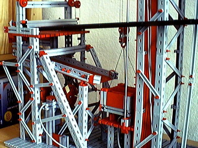 Der Querbalken staut die Kugeln auf. Zur vollen Stunde hebt er sich auf der linken Seite an und um Mitternacht ganz hoch. Dann rollen die Kugeln zurück in den Förderkorb.