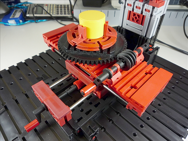 Der Aufsatzdrehtisch mit einem Spannteller für rotationssymmetrische (runde) Werkstücke. Mit einem Motorantrieb des Aufsatzdrehtisches wird das Modell mit Einschränkungen zu einer Karusseldrehfräse.