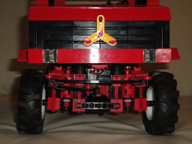 Die inneren Federn sitzen direkt auf den Drehachsen, sind daher ohne Federboden. Die Klemmbuchsen auf den Achsen sorgen dafür, dass sich die Federn nicht verschieben können. Um die fehlenden 5 mm für den fehlenden Federboden auzugleichen, habe ich die kleinen Hülsen mit Scheibe (35981) verbaut. Vorteil ist, dass ich so pro Seite eine Gelenkwürfel-Zunge (31426) leicht drunter schieben kann, um so ein Verschieben der gesamten Radaufhängung außen unter Last zu vermeiden. Ein Rattern des äußeren Kegelrades wird so unmöglich.