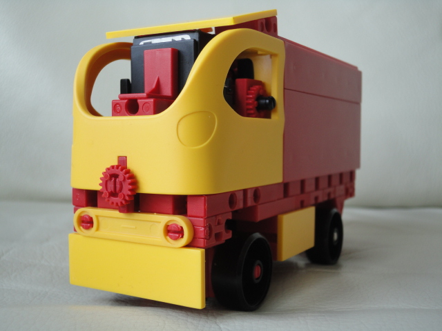 Gegenüber meinem ersten Modell sind die Proportionen deutlich stimmiger: Das Führerhaus ist größer und der Aufbau einen ganzen Grundbaustein flacher. Es fährt viel schneller, und die kleine Achsschenkel-Lenkung ist natürlich auch deutlich realistischer als ein Drehschemel.