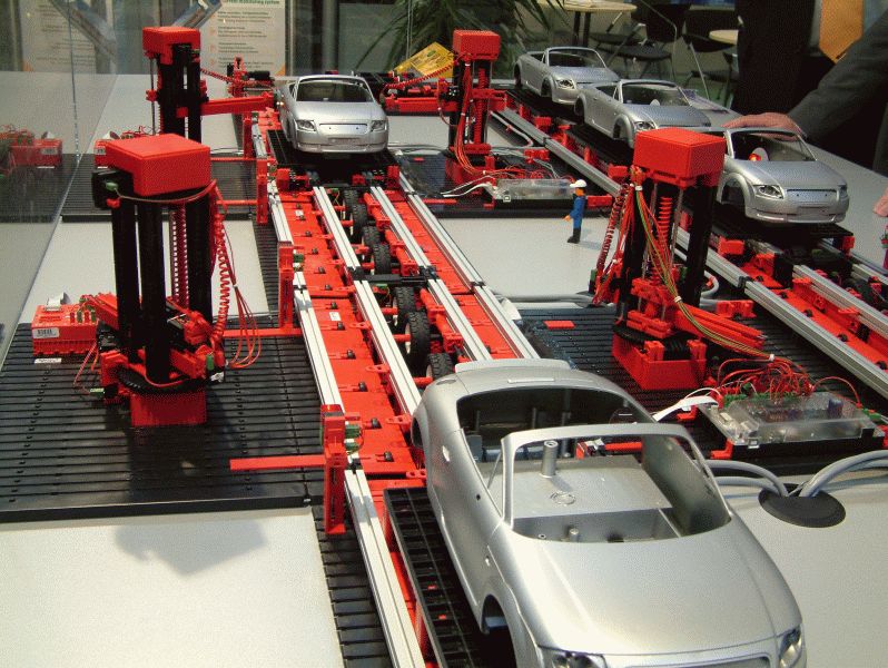 Das Transportband besteht aus zehn einzelnen Modulen, welche die Fahrzeugkarosserien in Abhängigkeit vom Zustand des nachfolgenden Moduls (frei / besetzt) transportieren oder “speichern”. Um einen automatischen Dauerbetrieb zu ermöglichen, gibt es neben dem eigentlichen Fertigungsband mit den vier Robotern auch einen Bandabschnitt für den Rücktransport der Karosserien. Hin- und Rücktransportband sind mit zwei Verschiebestationen verbunden, so dass ein Kreislauf entsteht. Die Steuersoftware wäre auch mit elf Karosserien klargekommen, es standen uns aber nur sechs Stück zur Verfügung. Alle Module signalisieren über eine rote oder grüne Leuchte ihren jeweiligen Zustand (frei / besetzt).
