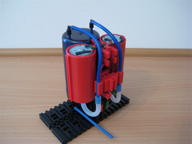 Der Kompressor besteht aus zwei Pollin Luftpumpen und einem Drucklufttank, platzsparend senkrecht montiert. Als Adapter für die beiden unterschiedlich dicken Schläuche dient jeweils eine FT-Düse, wobei das sich verjüngende Ende aufgebohrt wurde. In der “Simulationsfabrik mit Bearbeitungsstraße und Hochregallager” ist auf jeder Ebene so ein Kompressor verbaut. Im Vergleich zum blauen FT-Kompressor, geringe Stromaufnahme und vor allem leiser und deutlich weniger Vibrationen.
