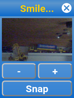 Das Foto-Fenster: Mit + bzw. - kann die Kameraanzeige gezoomt werden, um besser fokussieren zu können. Der Zoom hat keine Auswirkung auf das gemachte Foto. Mit “Snap” wird die Aufnahme im aktuellen Album gespeichert.