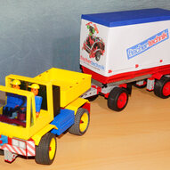Für meinen kleinen Kipper-LKW wollte ich schon länger einen Anhänger bauen. Auf Svens Anregung hin entstand dieses Modell basierend auf den Kippermulden 31844. Der Aufbau lehnt sich stark an den Hydraulik-Anhänger an, allerdings eben ohne Hydraulik und Kippfunktion. Die sehr raren Spriegel 31265 wurden durch von Sven konstruierte, selbstgefertigte 3D-Drucke ersetzt. Die “Plane” besteht aus Fotokarton und Papier.