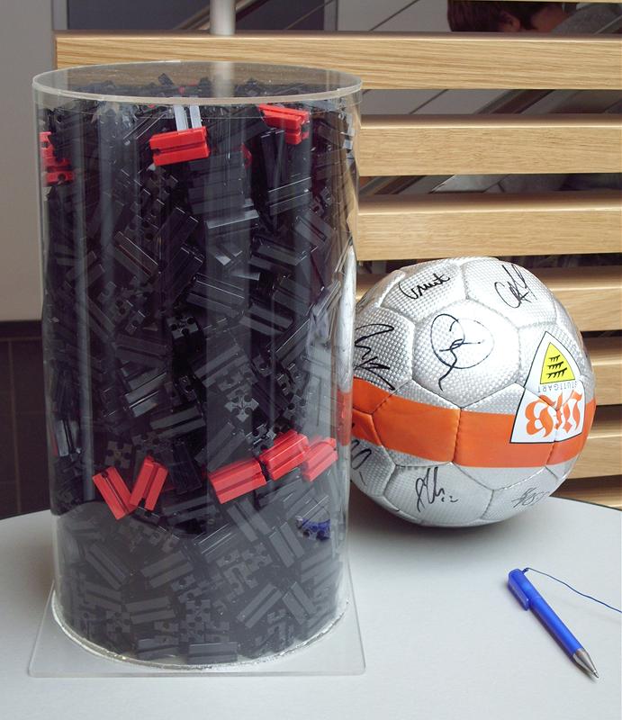 Wie viele Bausteine sind da drin? Erster Preis ist der Fußball rechts mit echten Unterschriften aller VFB-Fußballer (ich hoffe ich liege richtig), zweiter Preis ein neuer Bulldozer-Kasten, dritter Preis ein kleinerer Kasten. Man konnte vor Ort Zettel mit seiner Schätzung und Anschrift ausfüllen und einwerfen.